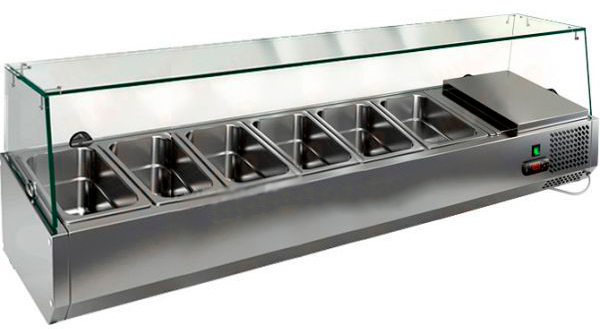 Витрина для ингредиентов Hicold VRTG 1425 устанавливается на предприятиях общественного питания и торговли для демонстрации, охлаждения и кратковременного хранения салатов, гарниров, закусок и других готовых блюд. Стеклянная надстройка и ножки. Корпус нержавеющая сталь.
