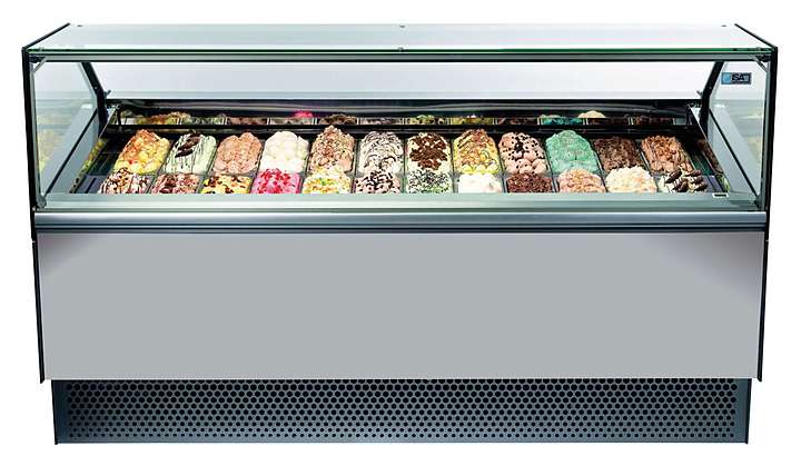 Витрина для мороженого ISA MILLENNIUM ST 155 с прямыми стеклами используется на предприятиях общественного питания и торговли для демонстрации и хранения мороженого, сорбета и йогурт-мороженого. Каркас изготовлен из углеродистой стали, окрашенной порошковой краской, дно зоны выкладки - из полированной нержавеющей стали, задняя панель - из пластифицированной стали, передняя панель - из окрашенной стали, полка - из алюминия, анодированного серебром. Цельный корпус имеет изоляцию из пенополиуретана, вспененного углекислотой, без использования озоноразрушающих веществ.