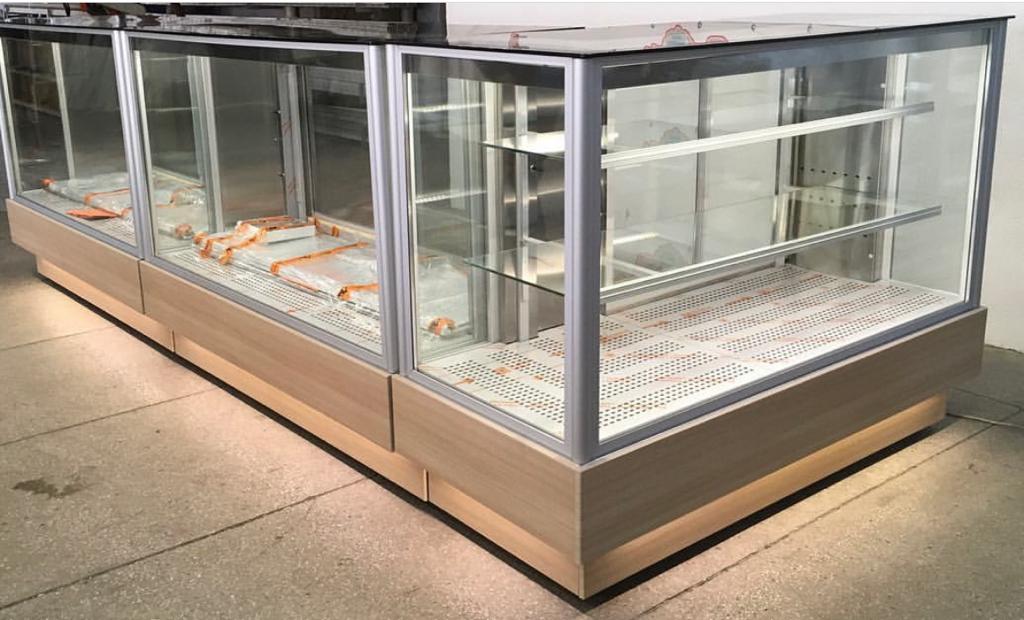 По всему периметру витрины установлены закаленные азотированные термо стеклопакеты с подогревом, соедененные через алюминиевую профильную систему.