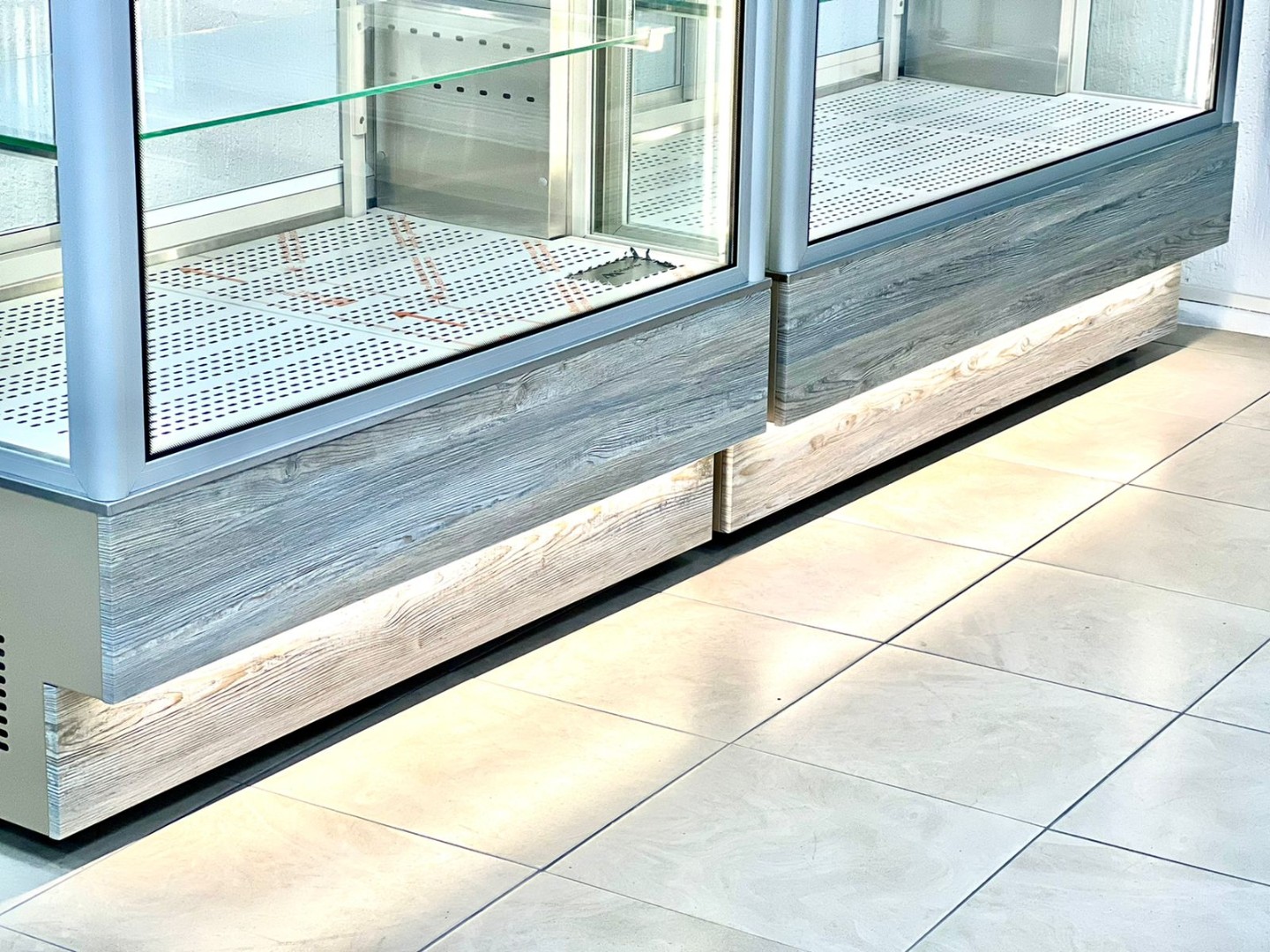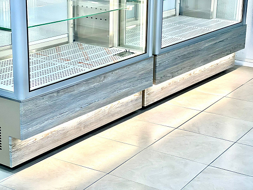 Фронтальная ступень витрины подсвечена и эффектно освещает зону пола перед витриной