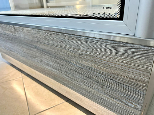 2. оцинкованная сталь с полимерным покрытием в любом цвете + нижние фронтальные части витрины выполнены в текстурированной промышленной ламинации