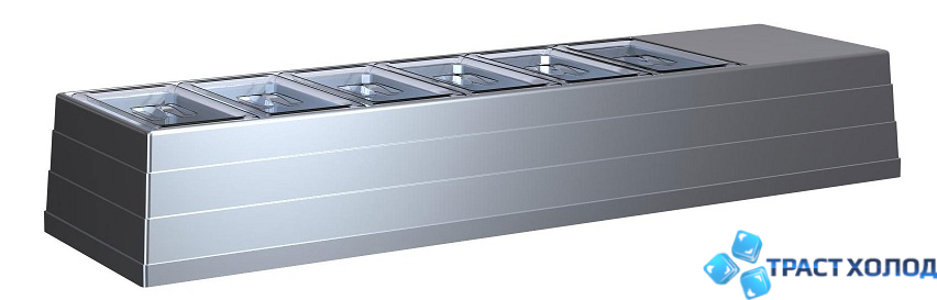 Встроенная холодильная система этой витрины позволяет держать в охлаждённом состоянии содержимое 6 гастроёмкостей, которыми комплектуется витрина (гастроёмкости из пищевого пластика, размером 325х176х150 мм).