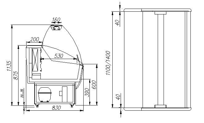Модель оснащена микропроцессорным блоком управления с индикатором температуры, ночными шторками из органического стекла и регулируемыми ножками высотой от 20 до 35 мм. Зона выкладки и столешница выполнены из окрашенной оцинкованной стали. Корпус имеет пенополиуретановую теплоизоляцию.