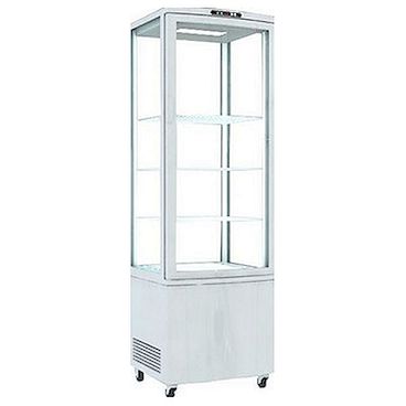 Шкаф холодильный витринного типа Gastrorag RT-235W среднетемпературный, панорамный, для напитков, с 1 распашной стеклянной дверцей, подсветкой, 3 полками-решетками имеет 4-х стороннее остекление, нижний агрегат, 4 колеса.