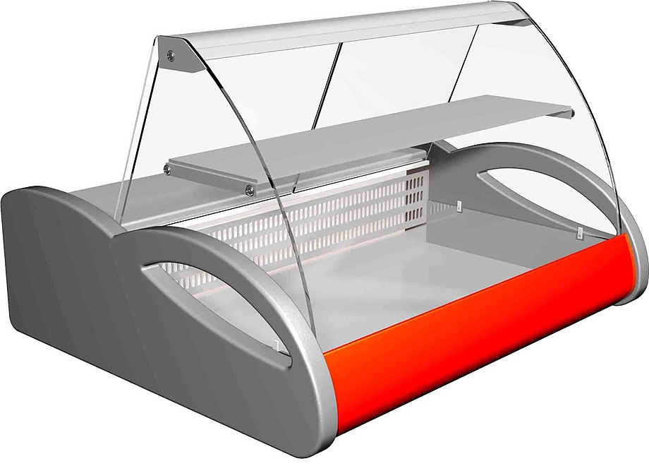 Модель оснащена гнутым передним стеклом, неохлаждаемой полкой и ночными шторками из органического стекла. Корпус выполнен из стали с ППУ-теплоизоляцией, передняя обшивка, столешница и полка - из нержавеющей стали, боковины - из черного пластика.