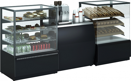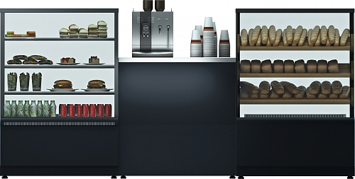 Прямые стекла. Отсутствие переднего стекла позволяет использовать витрину в зоне самообслуживания.