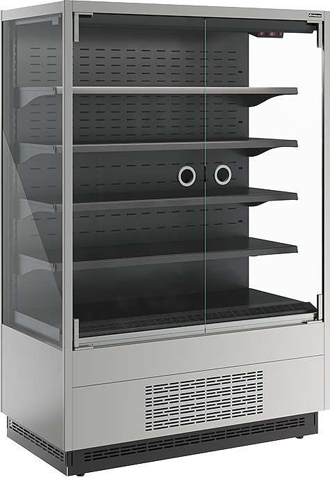 Витрина холодильная Полюс Carboma FC 20-07 VM 1,3-1 LIGHT фронт Х0 (версия 2.0) (9006-9005) используется на предприятиях общественного питания и торговли для охлаждения, кратковременного хранения и предпродажной демонстрации напитков, мяса, птицы, полуфабрикатов, молочных и гастрономических изделий. Модель оснащена 4 рядами навесных полок с кронштейнами, 2 распашными дверьми, подставкой с фронтальной термовыводящей и цокольной решетками. Корпус прямоугольно ориентированной формы выполнен из стали с антикоррозийным покрытием внешних панелей, полок и кронштейнов серого цвета (RAL 9006), цоколя и интерьера черного цвета (RAL 9005), теплоизоляция – из пенополиуретана.