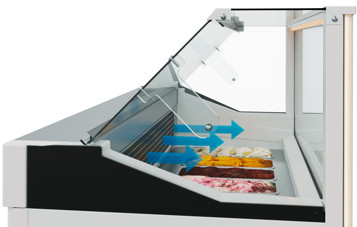Статическая система охлаждения позволяет избежать заветривания и засыхания продукта, способствует сохранению вкусовых качеств мороженого.