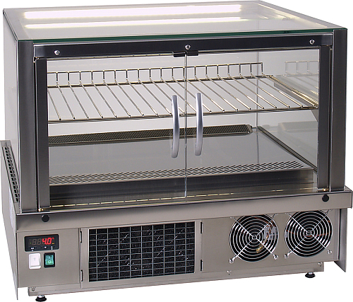 Модель оснащена выставочной панелью, съемной полкой-решеткой и подсветкой. Корпус выполнен из нержавеющей стали.