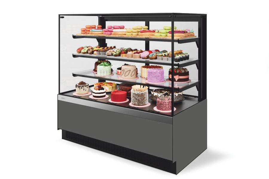 Витрина кондитерская Chilz Vete II kub lux 130, Серый матовый/шлифованная нержавейка (VG033.B7016M) – оборудование из обновленной серии кондитерских витрин VETE KUB.. Предназначена для самообслуживания, без переднего стекла. Это идеальное решение для точек общественного питания и магазинов, специализирующихся на продаже кондитерских изделий.
