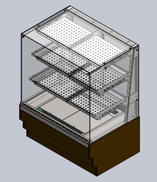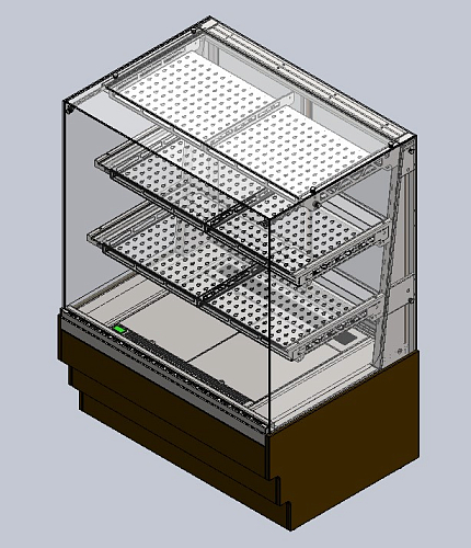 Витрина с охлаждаемой столешницей и внутренним охлаждаемым объемом закрытого доступа к продуктам, предназначена для эффектной демонстрации и хранения кондитерских изделий и десертов при температуре от +2°C до +8°C. Класс кондитерской витрины – среднетемпературный. В витрине имеется лоток для сбора конденсата. Размещение пищевых продуктов полочное, трёхъярусное, включая дно полезного объёма. Доступ к продуктам осуществляется с помощью раздвижных створок витрины со стороны рабочего персонала. Для удобства санитарной обработки, стеклянная дверка со стороны покупателя может открываться с ограничением на 20 градусов. Имеет освещение рабочей зоны над каждой полкой. Имеется внешний обдув стекла со стороны покупателя для исключения запотевания. В стандартный комплект поставки боковые стёкла в витрину и фасады не поставляются (доп. опция).