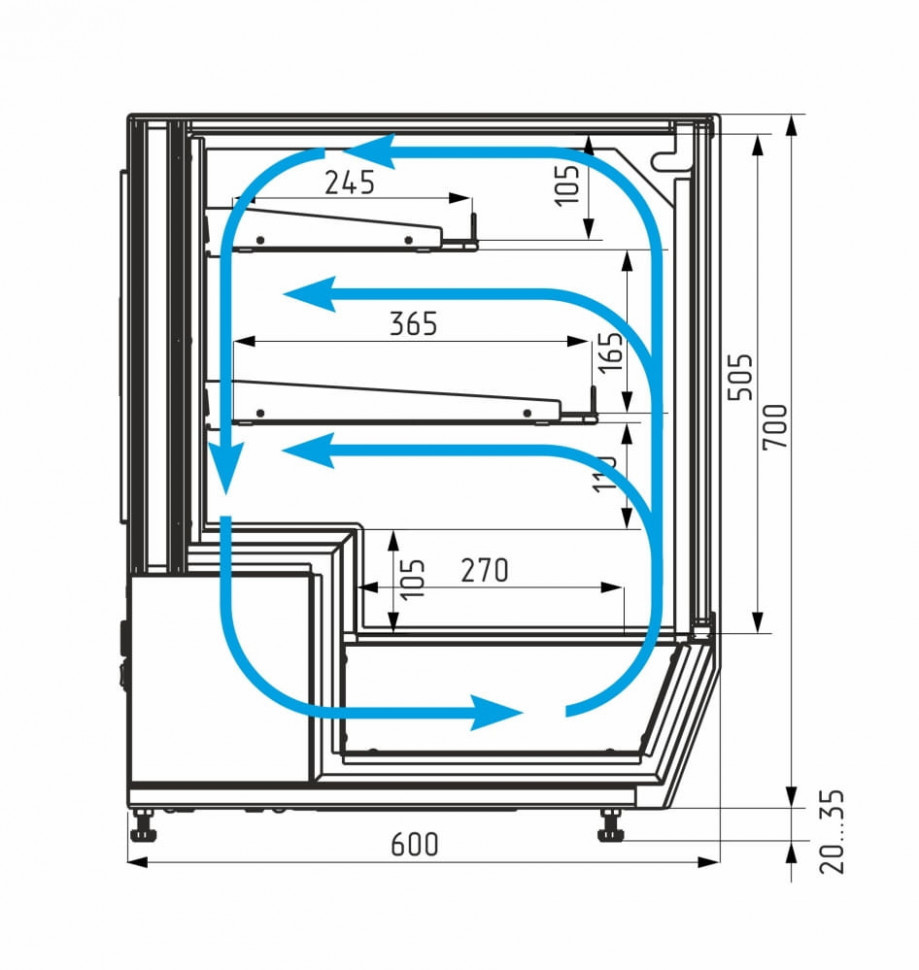 Витрина настольная AC59 VV 0,7-1 (0430) с прямым фронтальным стеклом, 2 полками-решетками с ограничителями, возможностью установки под углом 5*, и основанием для выкладки (666х270мм), боковой LED-подсветкой идеальна для стильной демонстрации выпечки, тортов, пирожных и пиццы. Температурный режим: +2/+10С. Горизонтальная площадь экспозиции - 0,56м2. Полезный объем - 0,06м3. Хладагент - R600a. Витрина разработана для использования в малых пространствах барных стоек и прилавков. Барная витрина имеет современный кубический дизайн и предназначена как для размещения на поверхности, так и для встраивания в барную стойку. Витрина имеет микропроцессорный блок управления с индикацией температуры, динамическое охлаждение, стеклопакеты с чёрной шелкографией, пенополиуретановую изоляцию корпуса, раздвижные задние створки из стеклопакета на роликах, выпариватель, 4 регулируемые по высоте опоры 20/35мм. Длина с боковинами - 700мм. Корпус изготовлен из нержавеющей стали. Климатический класс оборудования - 3. Витрина предназначена для эксплуатации в закрытом помещении с естественной вентиляцией при температуре окружающего воздуха от +12С до +25С и относительной влажности не более 60%.