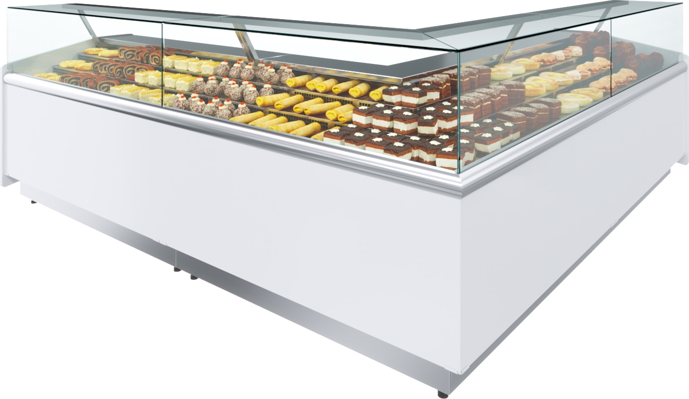 Неохлаждаемая стеклянная полка и регулируемые ножки высотой от 30 до 50 мм. Зона выкладки и столешница выполнены из шлифованной нержавеющей стали.