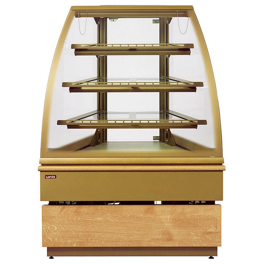 Витрина нейтральная угловая UNIS GEORGIA III, gold используется на предприятиях общественного питания и торговли для демонстрации, охлаждения и хранения кондитерских изделий.