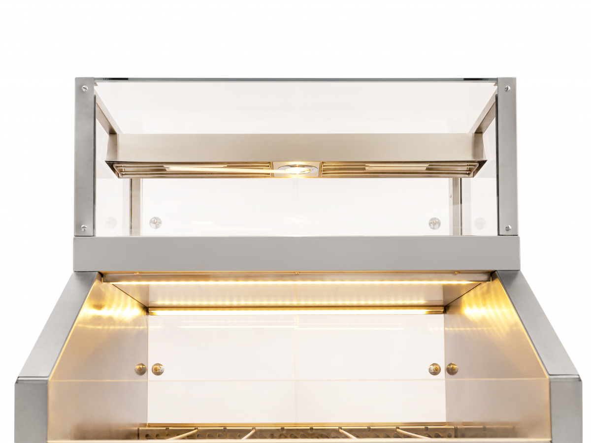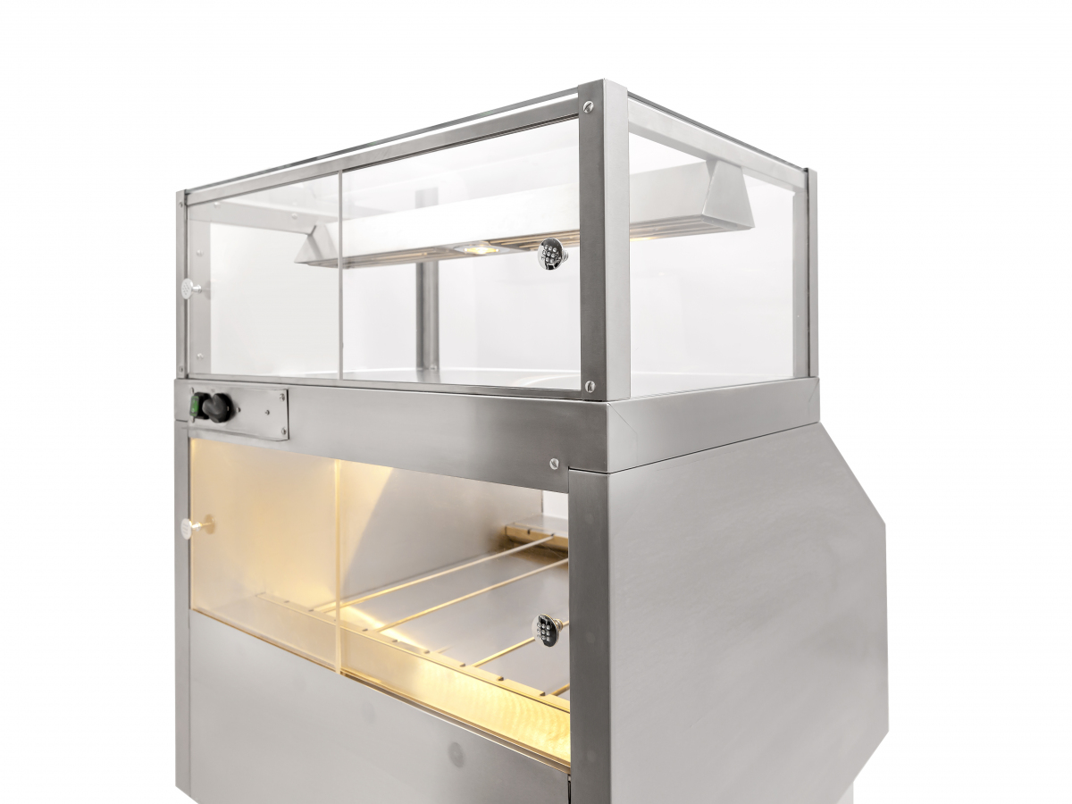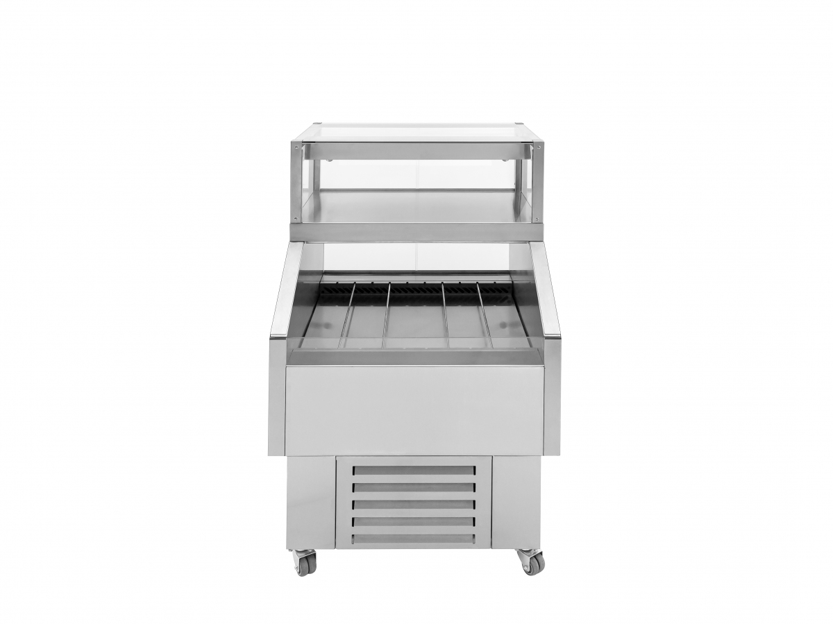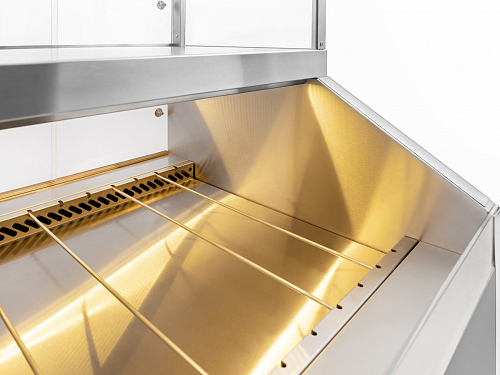 Изделие выполнено из нержавеющей стали AISI 430. Модель оснащена керамическими нагревающими элементами - сверху. Охлаждаемая поверхность с динамическим охлаждением имеет утопленную ванну с разделителями. Поверхность закрыта по бокам, сзади раздвижные дверки. Спереди доступ для покупателей. Температурный режим +4…+8*С. Светодиодная подсветка (теплый свет). Для слива конденсата предусмотрено сливное отверстие, через которое вода попадает в сливную трубу и отводится в лоток.