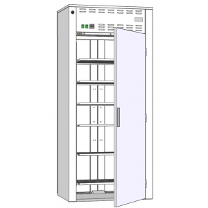 Модель оснащена 6 регулируемыми по высоте полками, которые можно устанавливать как горизонтально, так и под наклоном, распашными стеклянными дверками спереди и глухой распашной дверью сзади. Корпус выполнен из нержавеющей стали.