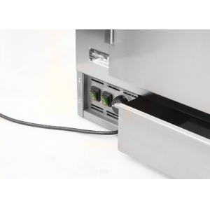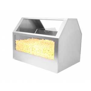 Витрина оснащена светодиодной подсветкой. Объем разделен на две секции прозрачной перегородкой. Спереди прозрачное стекло, со стороны оператора дверка для загрузки попкорна. Лоток для шелухи и панель управления расположены с противопоожной стороны от клиентской зоны (открытая часть витрины). Регулировка температуры +30/+85C.
