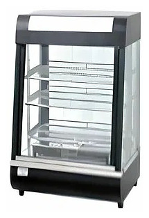 Витрина тепловая Enigma FW-601 имеет 3 регулируемые хромированные полки-решётки для выкладки, 4-х стороннее остекление, дверцы-купе со стороны оператора и клиента, светодиодную подсветку, электромеханическое управление, дисплей температуры, ванночку для пароувлажнения, 4 ножки.