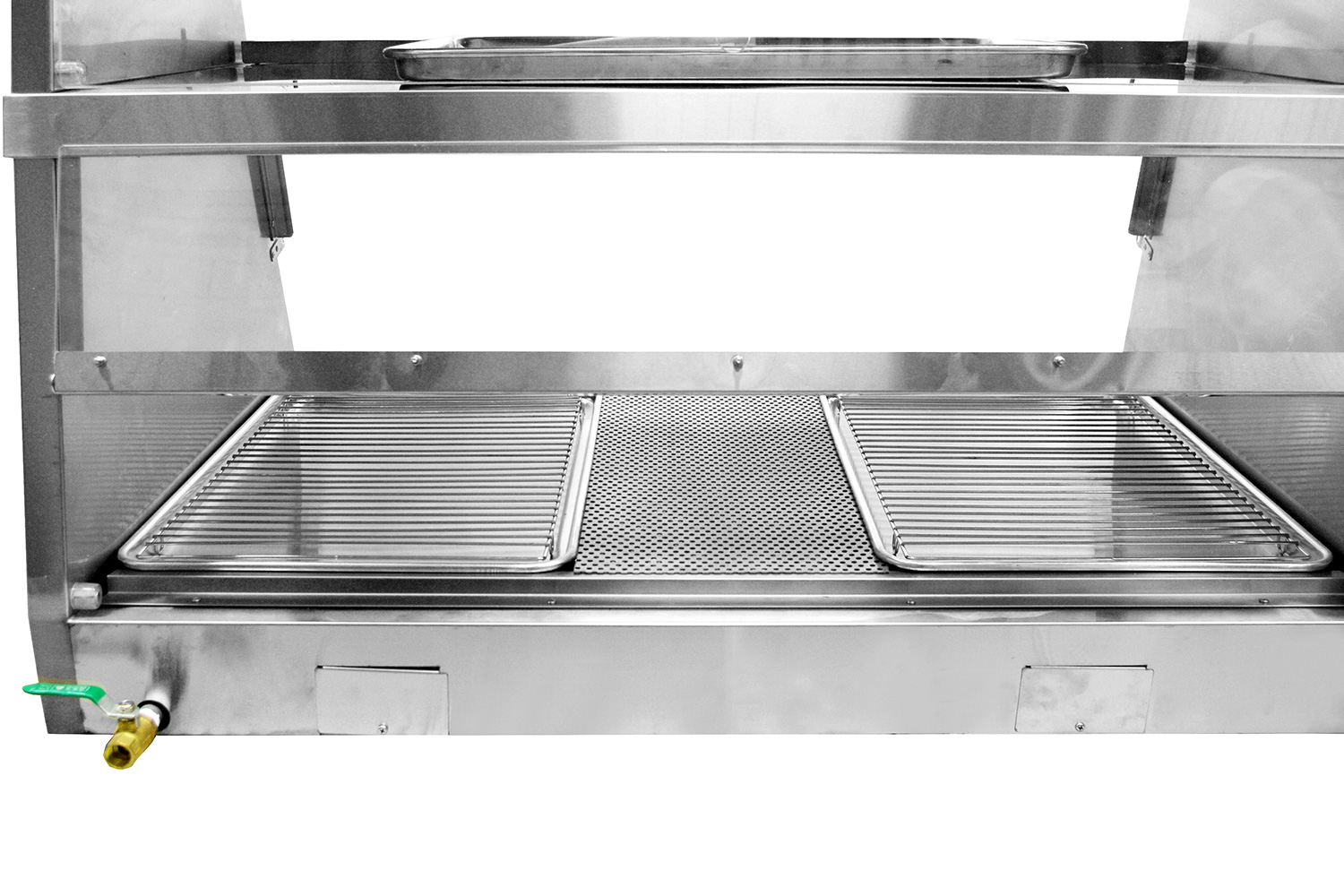 • В комплекте поставки 3 подноса размером 60*40см, 2 сетки для выкладки продуктов, 1 сетка для нижнего яруса.