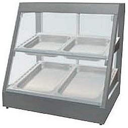 Витрина тепловая ТТМ ISEE-HOT-2GREY с пароувлажнением, принудительная конвекция с подсветкой. Корпус крашенный, две наклонные полки: нижняя - под 2 гастроемкости GN1/1 глубиной 65 мм, верхняя - под 2 гастроемкости GN2/3 глубиной 65 мм. Витрина сзади имеет раздвижные дверцы.  Установка — на передней линии, если заведение работает по принципу самообслуживания или на передаточной линии при обслуживании клиентов оператором