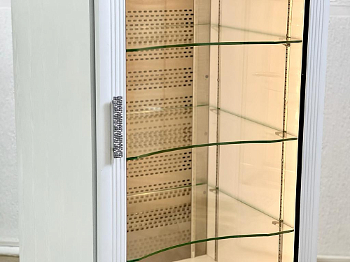 Шаг кронштейна полки 1,5 см. Стеклянные полки толщиной 8 мм имеют размер 560 *650 мм и технологическую выемку по одной стороне. Площадь выкладки с учетом нижней зоны 2 кв.м.
