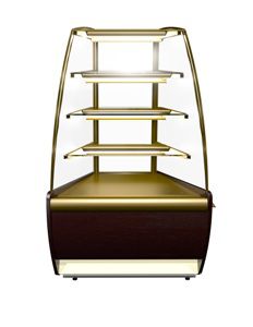 • Витрина имеет светильники над каждой полкой, гнутое фронтальное стекло, три освещаемые фиксированные полки (размером 860х300 мм) и ночные шторки из оргстекла.