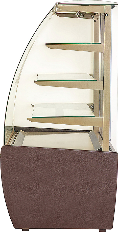 Модель оснащена изогнутым фронтальным и прямыми боковыми стеклами, 3 фиксированными полками и регулируемыми ножками высотой от 20 до 35 мм. Основание и декоративные панели выполнены из стали, боковины - из пластика с пенополиуретановой теплоизоляцией, раздвижные задние створки - из оргстекла.