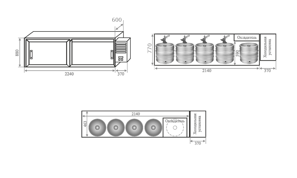 Вместимость камеры: 5 евро кега с одетыми заборными головками. Расположение кег в один ряд. Данная встраиваемая холодильная камера, по сути, представляет из себя барный кегератор BERK с уменьшенными габаритами по высоте без столешницы. Располагается эта камера под барной стойкой занимая объем пространства, в котором ранее помещался проточный охладитель и кеги.