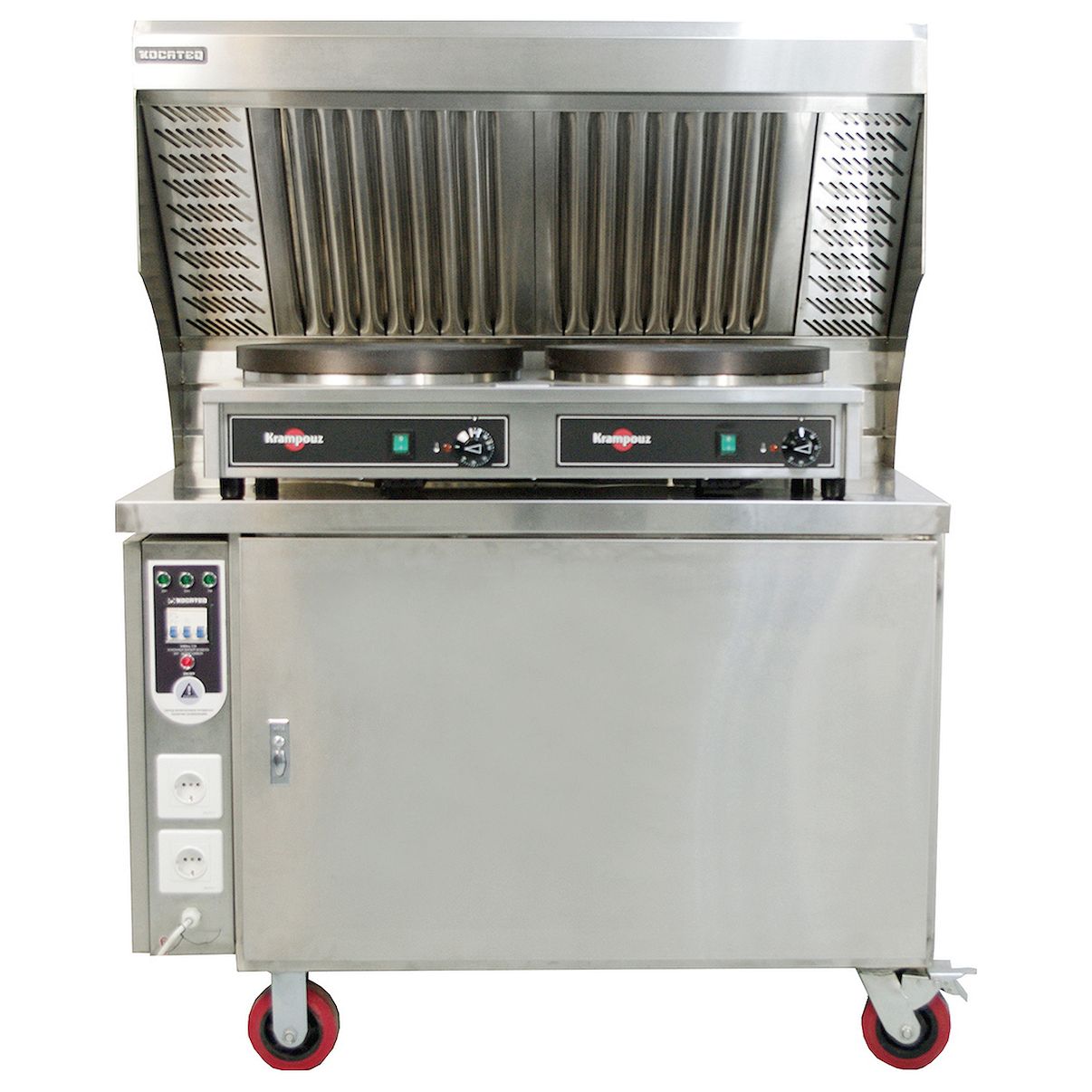 Пристенный вытяжной зонт на стенде Kocateq VWALL 110 применяется в заведениях общественного питания (ресторанах, кафе), пекарнях и кондитерских для очистки воздуха из зоны готовки от жира и гари. Модель имеет встроенную систему очистки воздуха с 3-мя стадиями (лабиринтными фильтрами из нержавеющей стали, фильтром с активированным углём и электростатическим), 2 встроенные во фронтальную поверхность розетки 220/1/50, колёса для перемещения.
