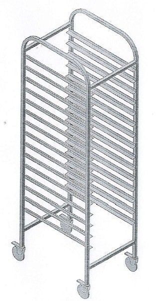 Тележка транспортировочная WLBake TR-15 используется на кондитерских и хлебопекарных производствах для временного хранения и транспортировки полуфабрикатов и готовой продукции, а также для размораживания и окончательной расстойки тестовых заготовок в цехах. Это оборудование имеет сборно-разборую конструкцию, вместимость - 15 противней размером 600х400 мм, загрузку по широкой стороне, расстояние между уровнями 100 мм, 4 колеса с 2 тормозами.