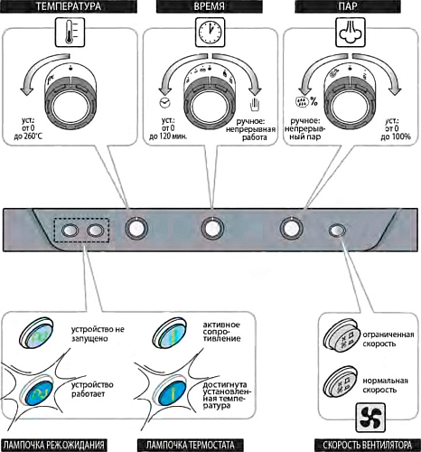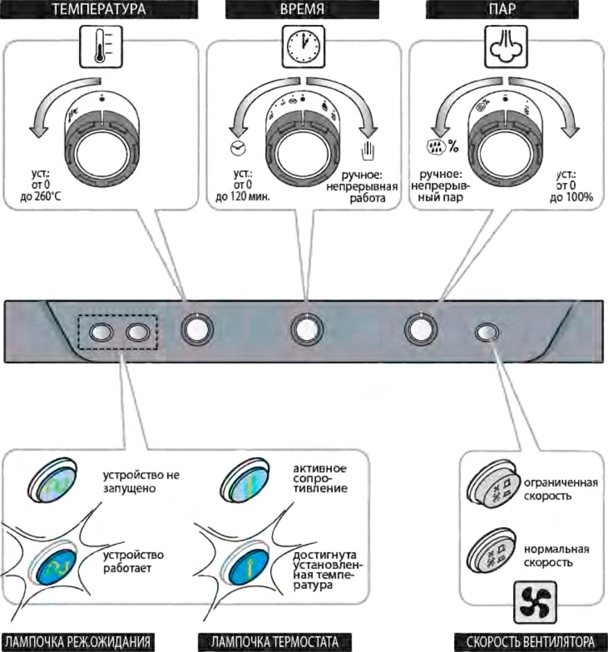 • Пароконвекция при температуре от 48 до 260 °C