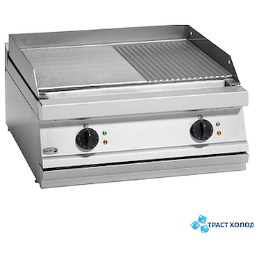 Аппарат имеет комбинированную жарочную поверхность, половина которой гладкая, а вторая половина рифленая. Регулировка рабочей температуры поверхности в диапазоне от 120 до 310°C. Имеется желоб для стекающей жидкости. Предусмотрены бортики для предотвращения разбрызгивания жира.