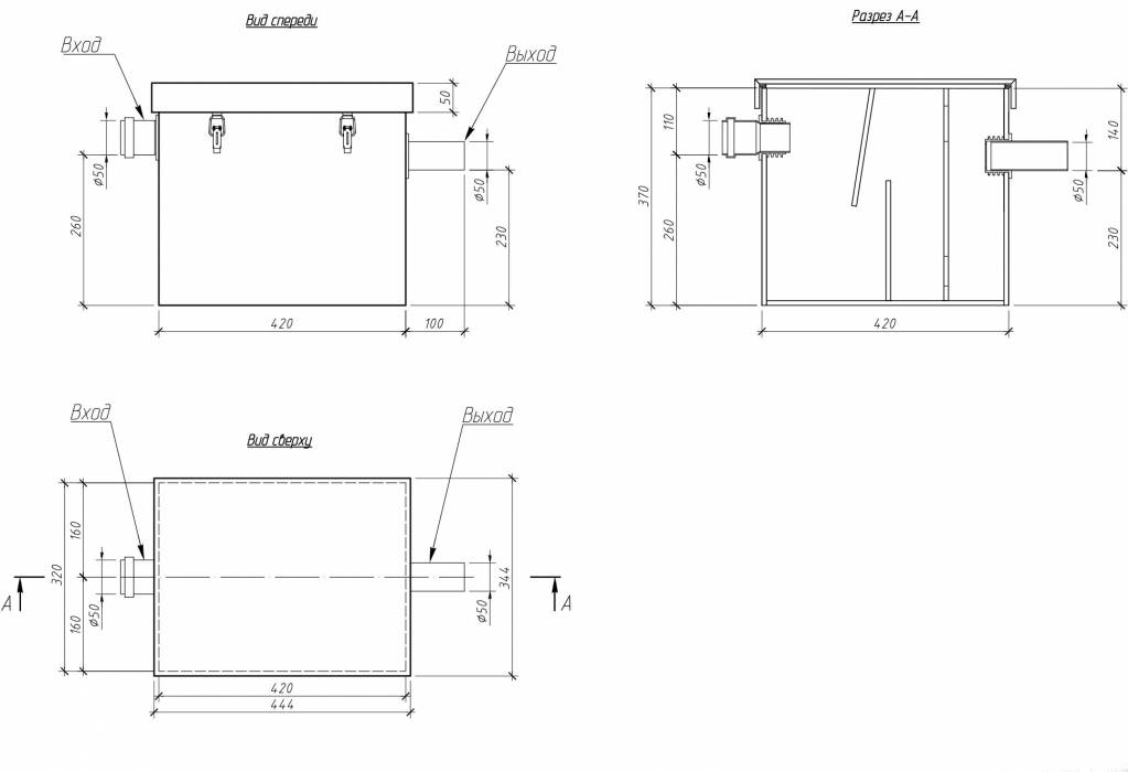 Устройство имеет небольшие размеры и устанавливается под мойкой до попадания стока в трубопровод канализации.