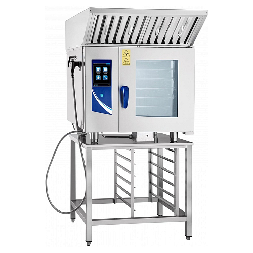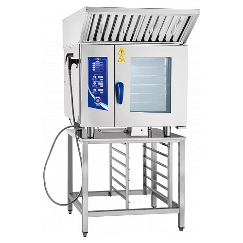 Зонт состоит из трех основных частей: корпуса, съемного лабиринтного фильтра и вентилятора. Подсоединяется к мини-пароконвектомату с помощью кабеля питания (1,8 м с заземлением) и фиксируется с помощью уголков и болтов М5 к задней стенке мини-пароконвектомата.